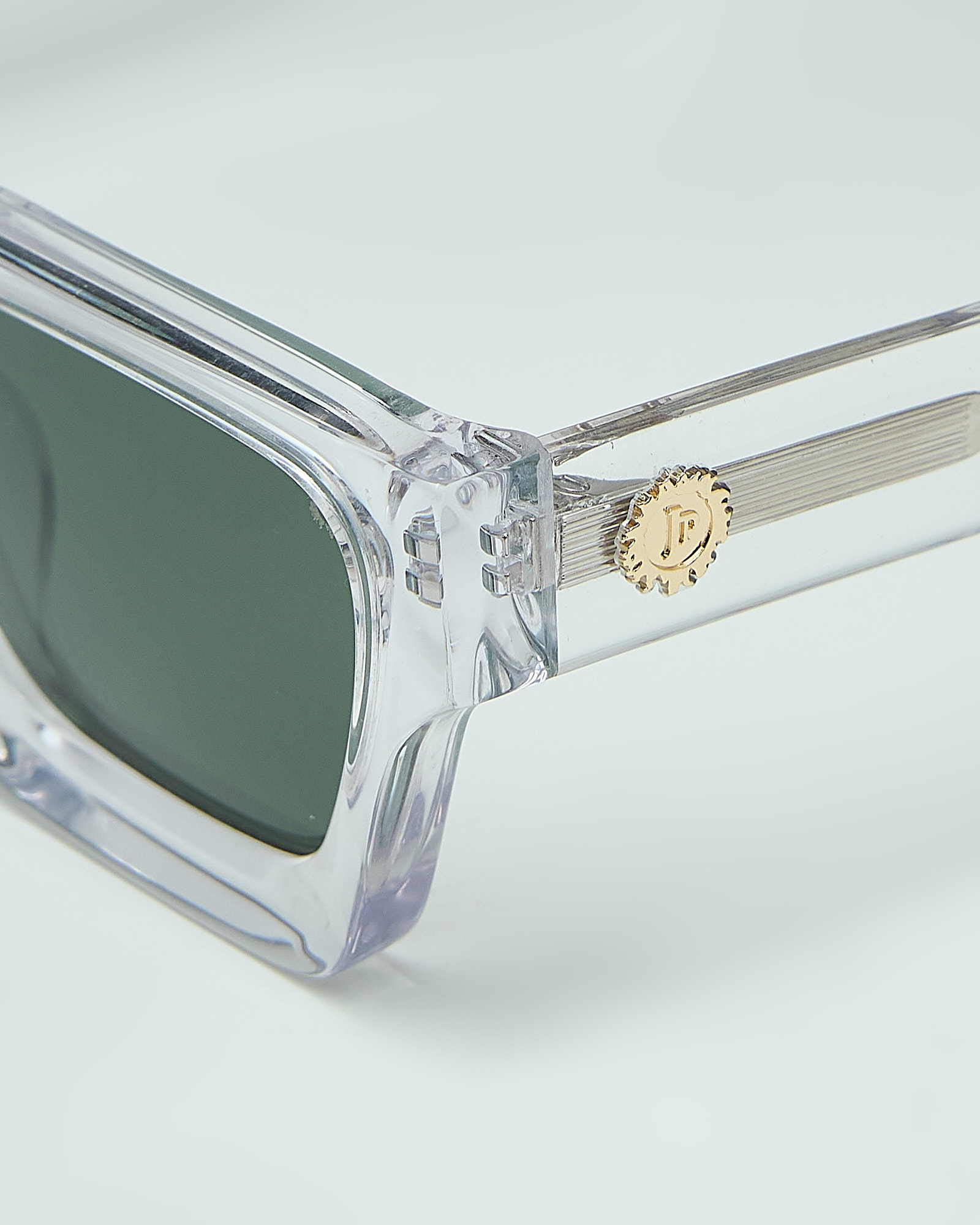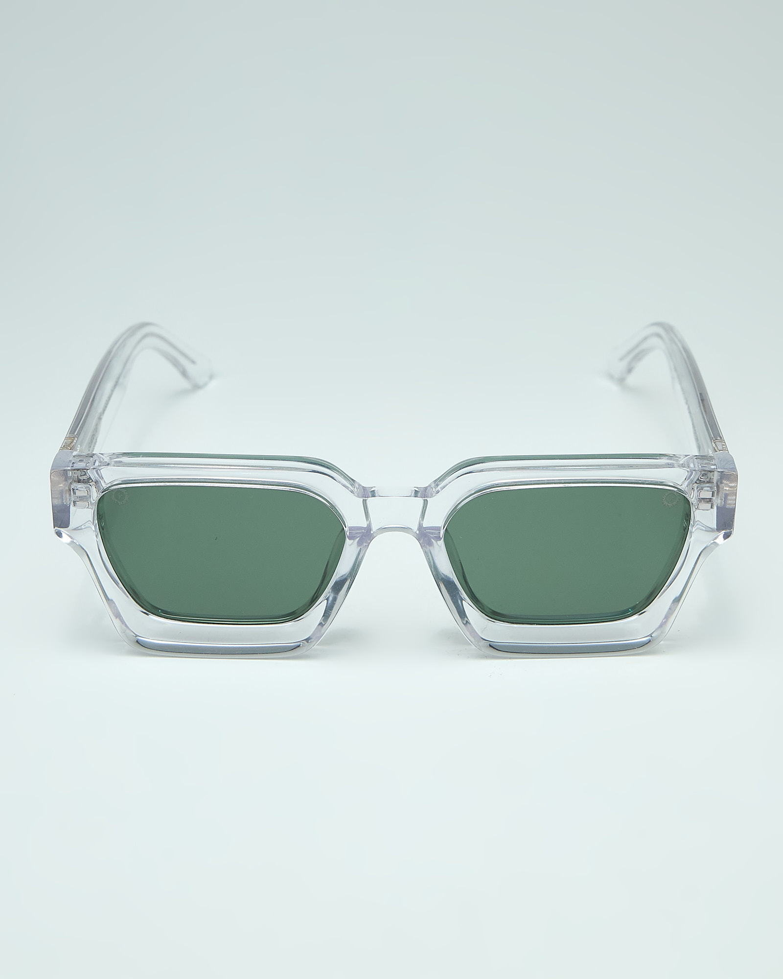 The bold rectangular silhouette maintains precision and balance, while the polarized clear-green lenses introduce vitality and visual harmony under bright sunlight.