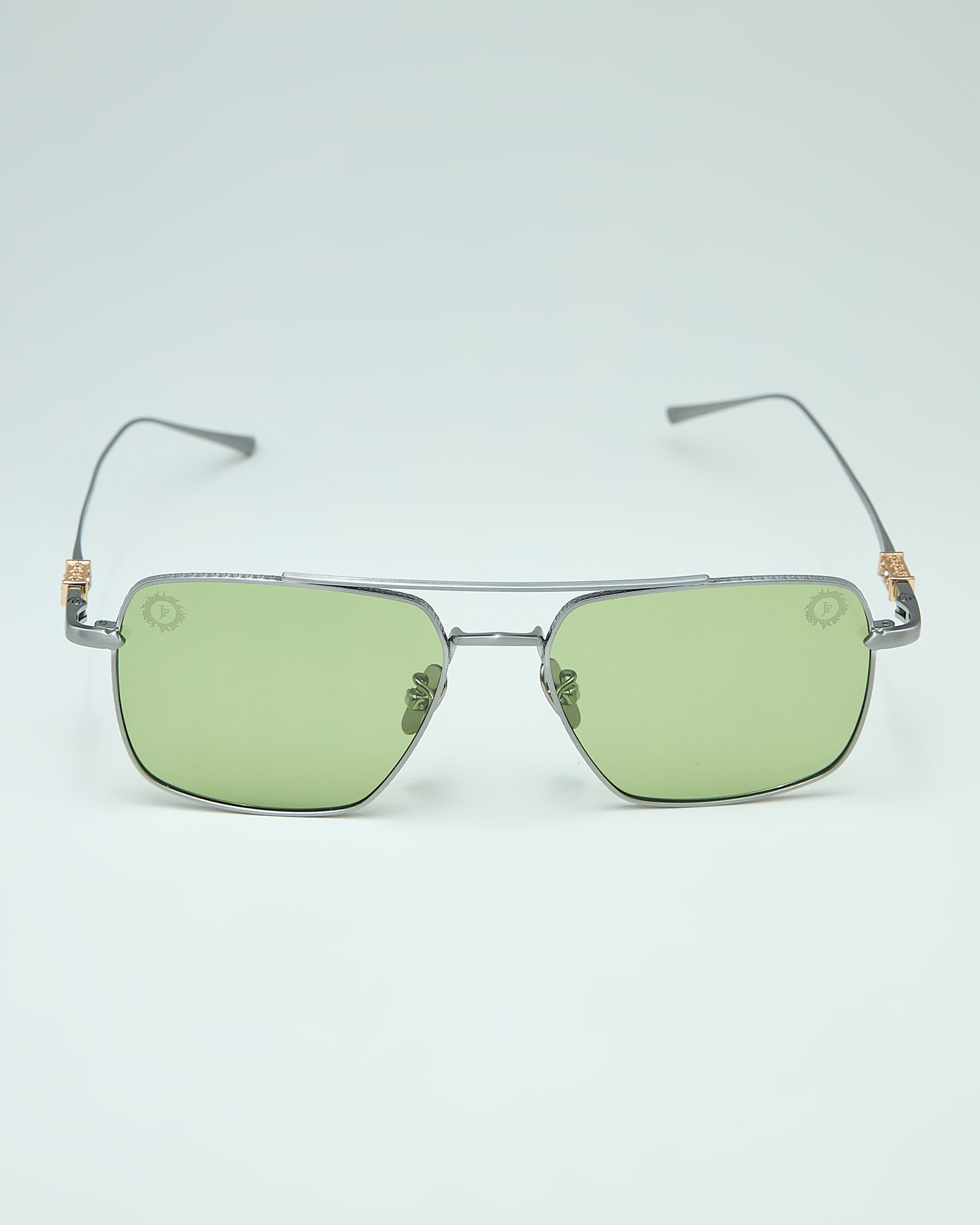 are handcrafted from ultra-light titanium in a polished silver finish, defined by a refined rectangular silhouette with delicate engraved detailing and gold inlay on the temples.