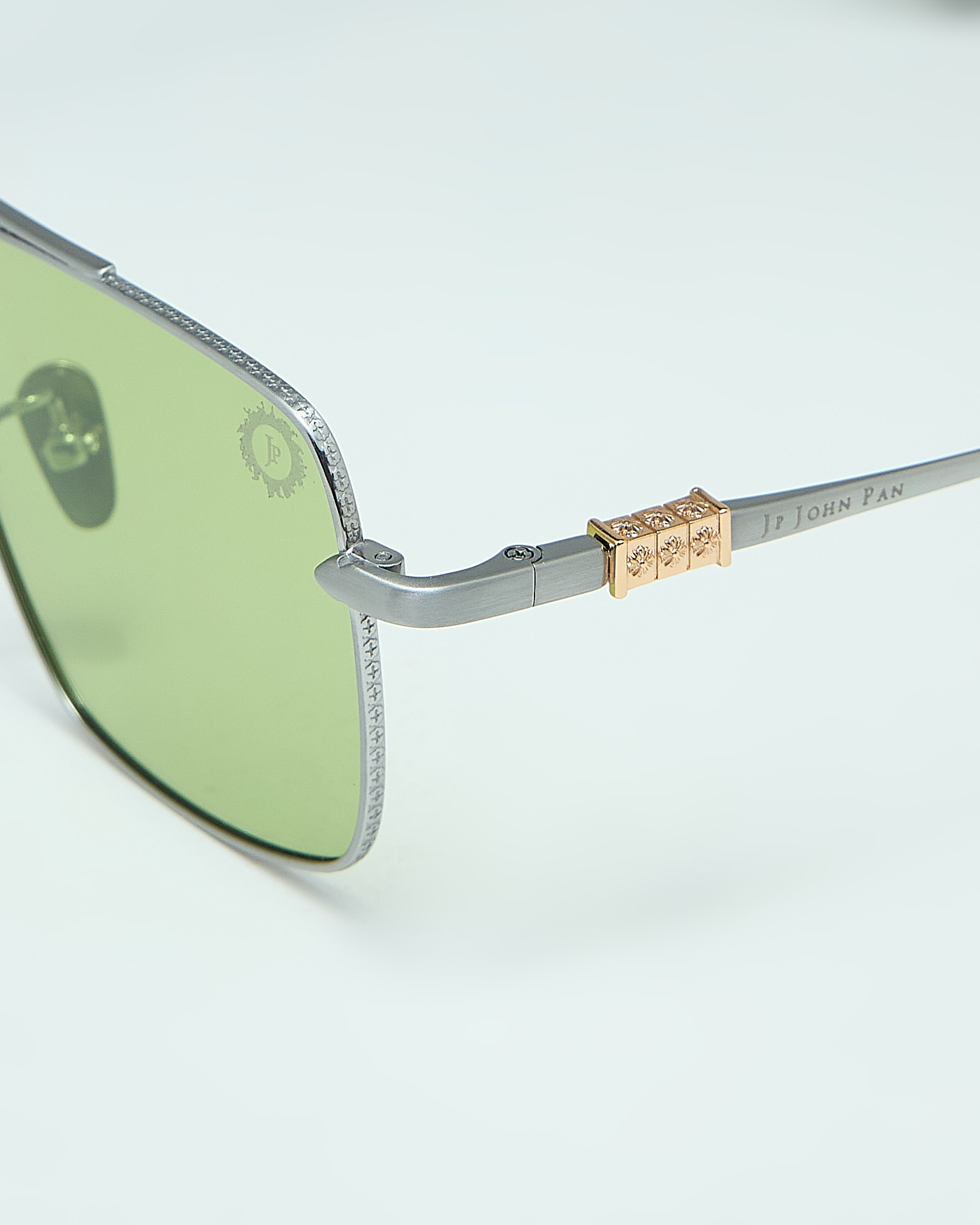 The silver titanium structure creates a clean and weightless presence, while the engraved details and gold inlay introduce refined contrast and craftsmanship.